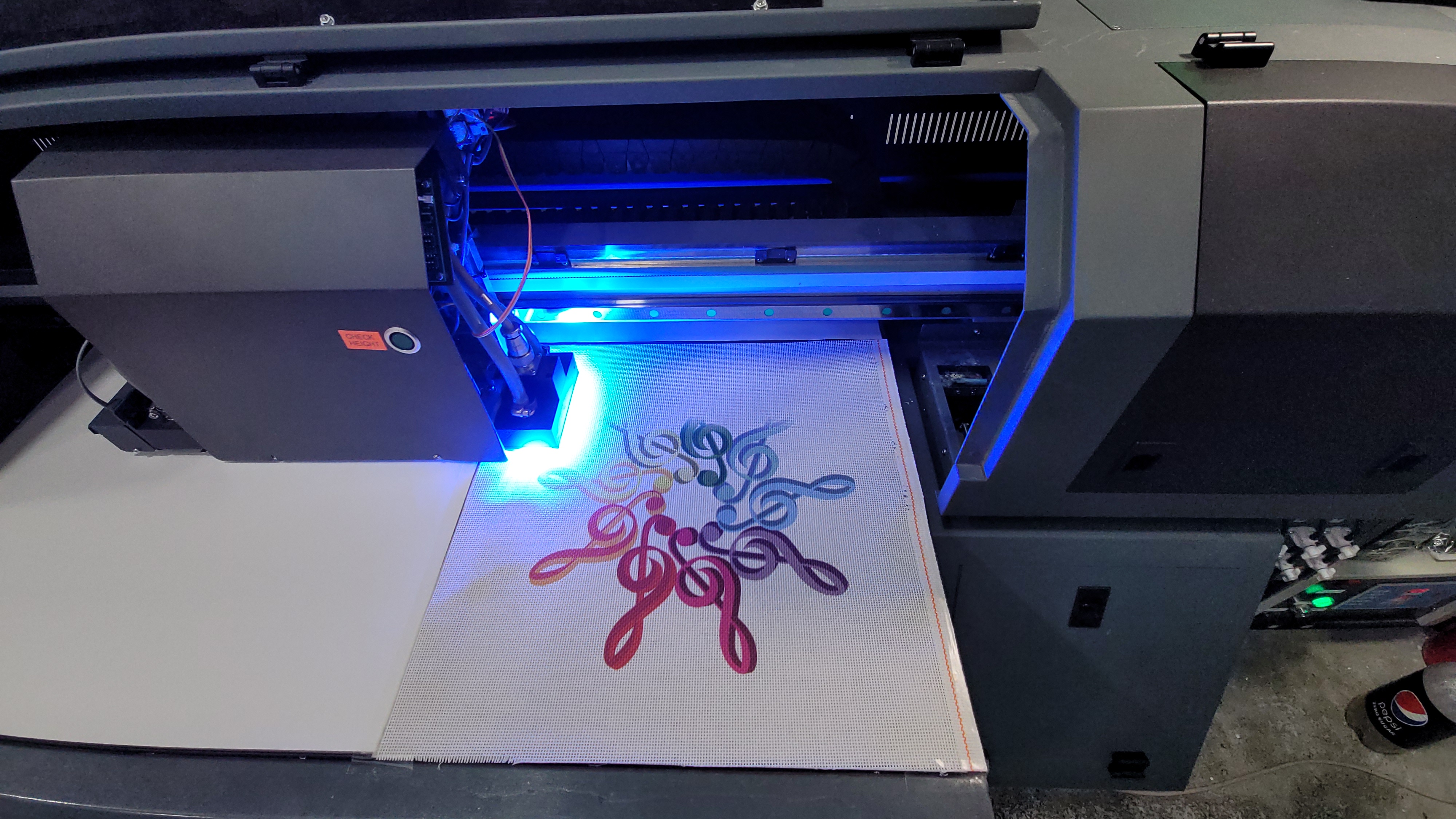 In UV printing, LED lights are used for curing instead of heat. The specially designed high intensity UV light closely follows as the special ink is distributed on the canvas, drying it as soon as it is applied. Because the ink transforms from a solid paste to a liquid immediately, there is no chance for it to evaporate and no VOCs, toxic fumes or ozone are released. This makes the process environmentally friendly with almost zero carbon footprint.